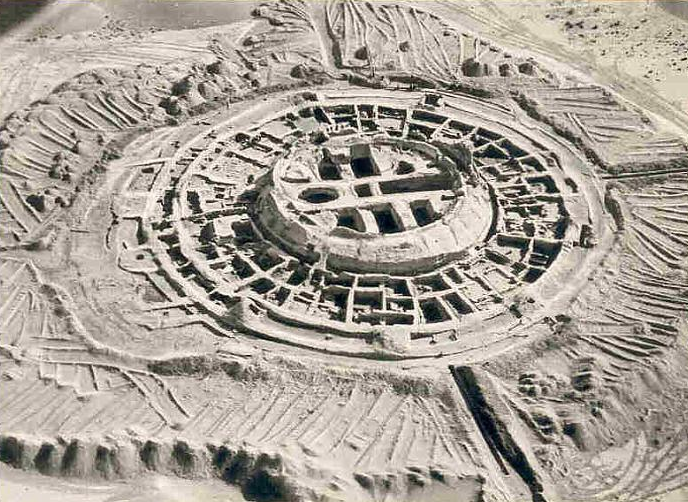 The next fortress is Koykirilgan Kala. While today little is visible but a dusty mound, the original plan of the site consisted of a rounded, two story building 45 meters in diameter fortified by a double ring wall with arrow slits and towers.